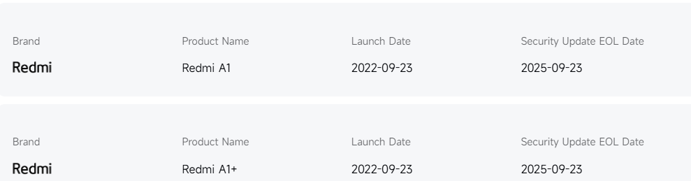 O Redmi A1, o POCO C50 e o A1+ estão entre os primeiros a chegar ao fim da vida útil. Esses dispositivos foram lançados com o MIUI 13 no Android 12 e não receberam atualizações por mais de um ano, o que é consistente com os ciclos de suporte típicos para produtos de nível básico.