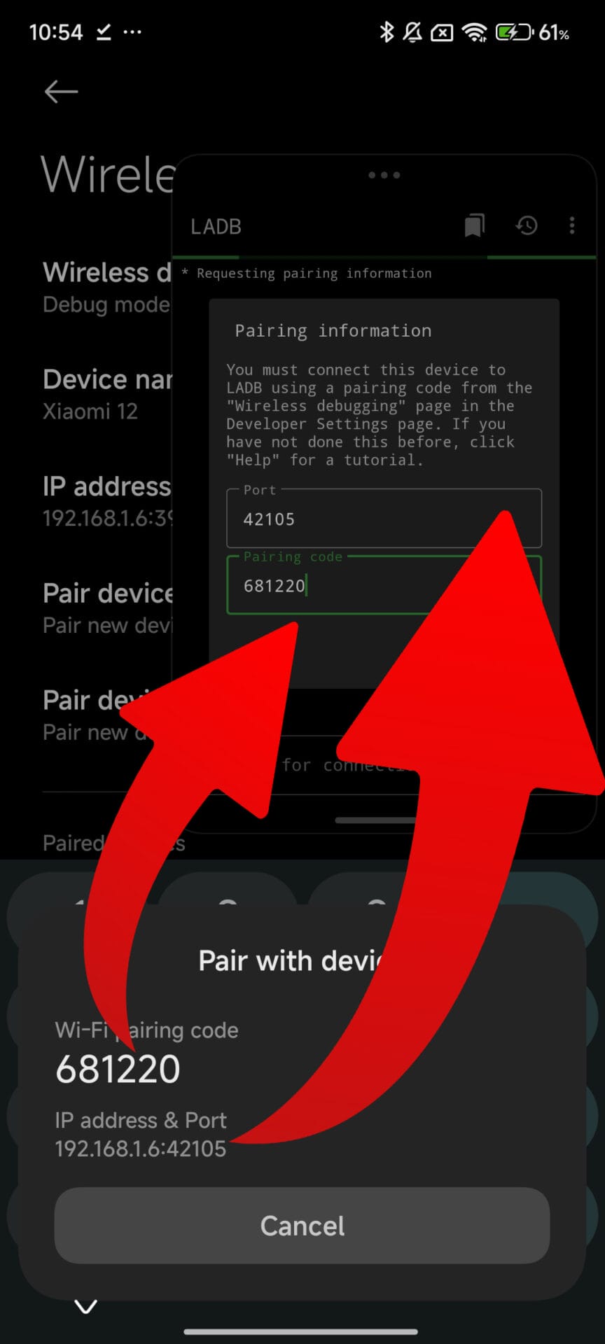 4. Digite o endereço IP, a porta e o código de emparelhamento no LADB.