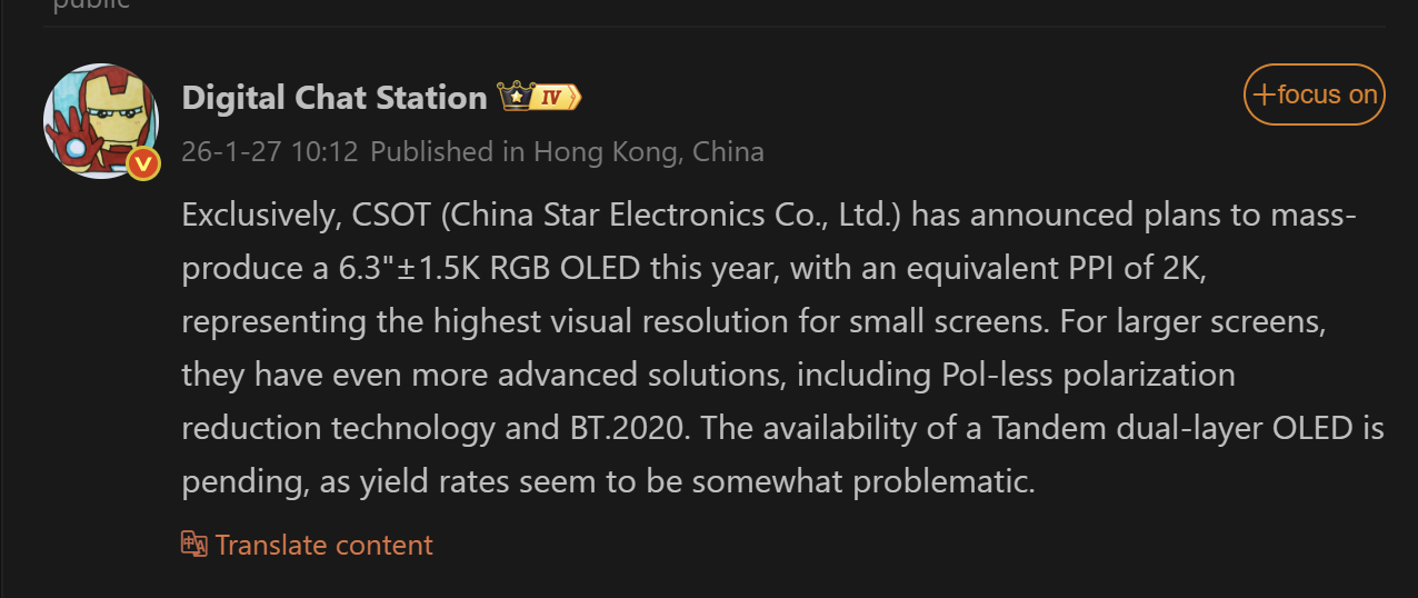 Estamos acompanhando os rumores sobre a próxima geração de carros-chefe, e as informações mais recentes da Digital Chat Station no Weibo são particularmente picantes. O vazador confirmou que a CSOT está produzindo em massa uma tela OLED RGB de 6,3″ ± 1,5K este ano.