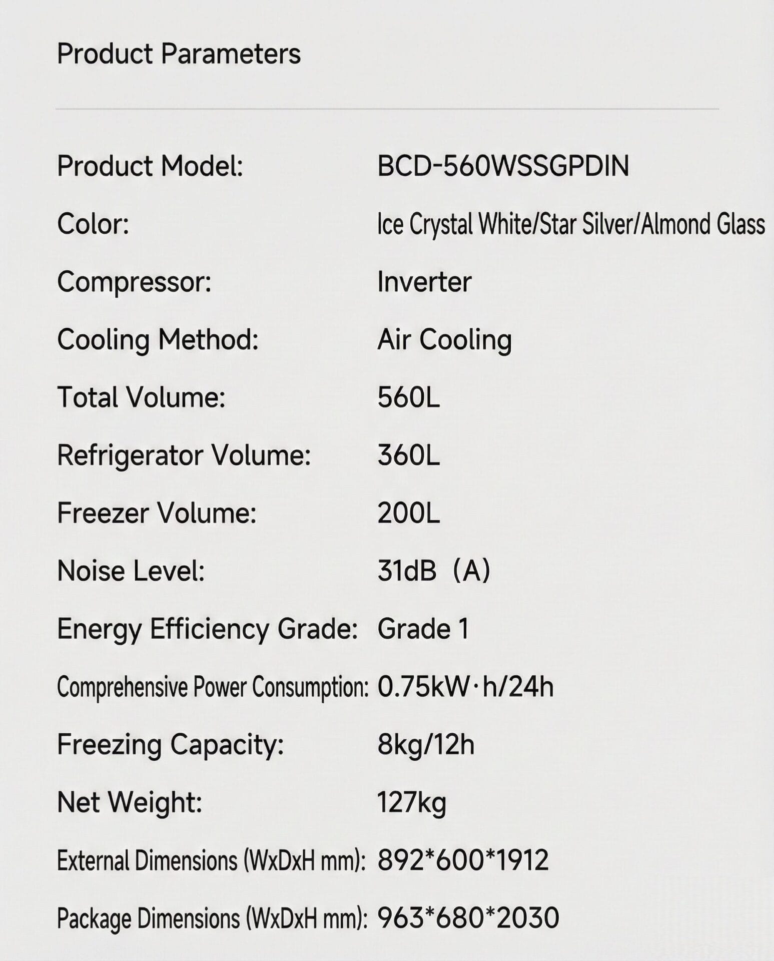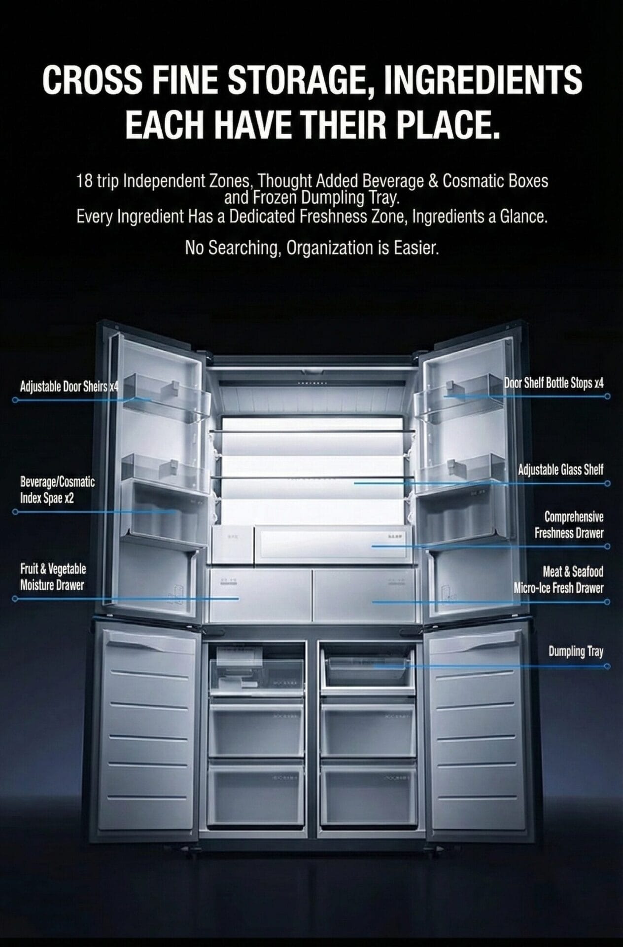Diferentemente dos refrigeradores verticais comuns, esse modelo usa um layout interno do tipo cruzado para melhor organização do espaço e acessibilidade. A capacidade de 560 litros foi projetada para residências grandes e arquiteturas de cozinha embutidas.