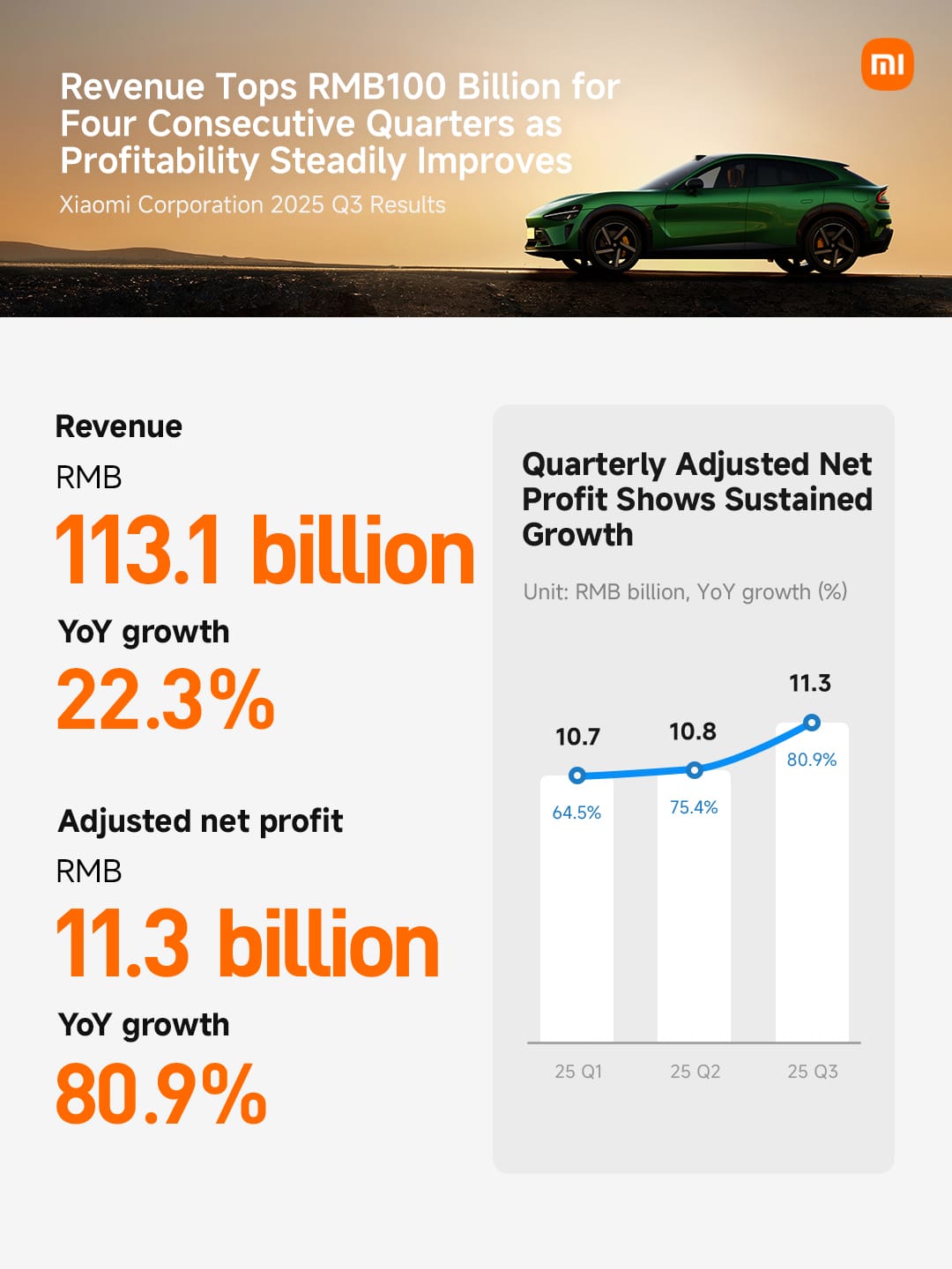 A Xiaomi anunciou oficialmente seus resultados financeiros não auditados para o terceiro trimestre de 2025, com a empresa registrando seu trimestre mais forte até o momento e marcando um salto significativo em sua estratégia de longo prazo “Homem × Carro × Casa”. A receita foi de RMB113,1 bilhões, aproximadamente US$ 15,6 bilhões, representando um aumento de 22,3% em relação ao ano anterior. Esse trimestre também representa o quarto período consecutivo em que a Xiaomi excedeu RMB100 bilhões em receita. (Relacionado: Análise da série Xiaomi 17 | Visão geral dos recursos do HyperOS 3) O lucro líquido ajustado do Grupo aumentou 80,9% para RMB11,3 bilhões (US$ 1,56 bilhão), superando significativamente as expectativas do mercado.