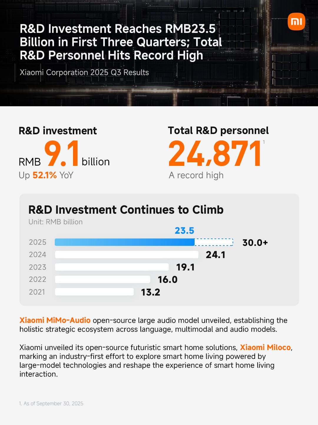 Durante esse período, a Xiaomi investiu ainda mais pesadamente em tecnologias fundamentais, com gastos trimestrais em P&D aumentando 52,1% para RMB9,1 bilhões, ou US$ 1,26 bilhão. O total de funcionários de P&D aumentou para 24.871, representando um recorde histórico. Os principais marcos recentes de P&D incluem: