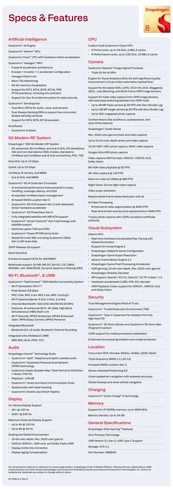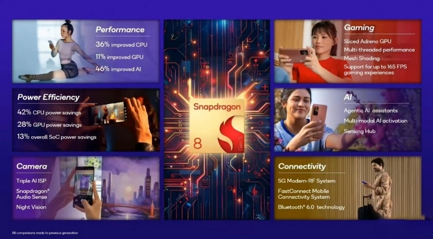 O Snapdragon 8 Gen 5 é fabricado usando o processo de 3 nm da TSMC, utilizando uma configuração de CPU robusta que inclui dois núcleos principais de 3,8 GHz e seis núcleos de desempenho de 3,32 GHz. Isso permitirá que a distribuição das cargas de trabalho de desempenho seja bem equilibrada, levando em consideração a eficiência energética estável. Em comparação com o Snapdragon 8 Gen 3 de dois anos atrás, a Qualcomm alega um aumento de 36% no desempenho da CPU, uma melhoria de 11% nas operações da GPU e um consumo geral de energia 13% menor.