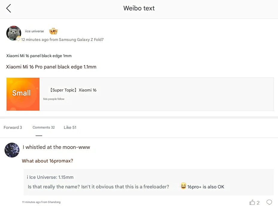 - Xiaomi 16 Pro Max: borda preta do painel de 1,15 mm