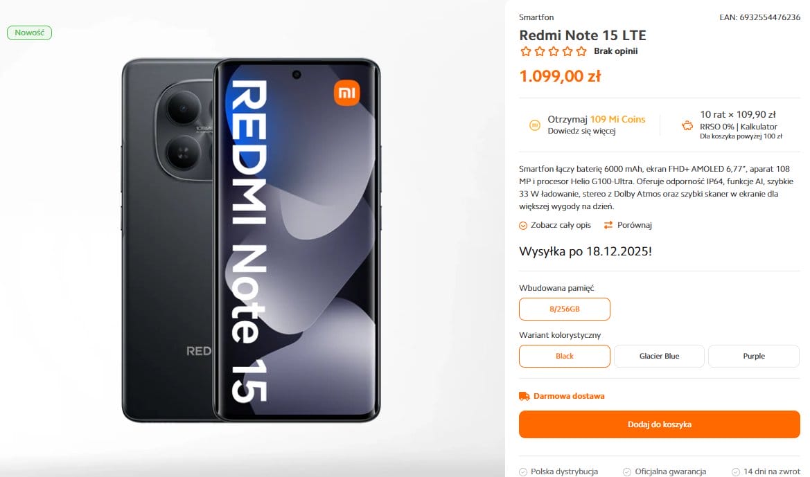 | Redmi Note 15 LTE | 1.099 PLN | ~$290 |