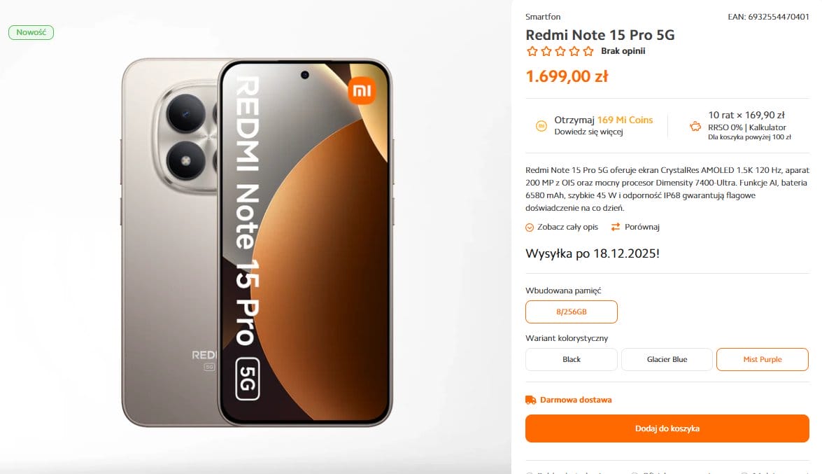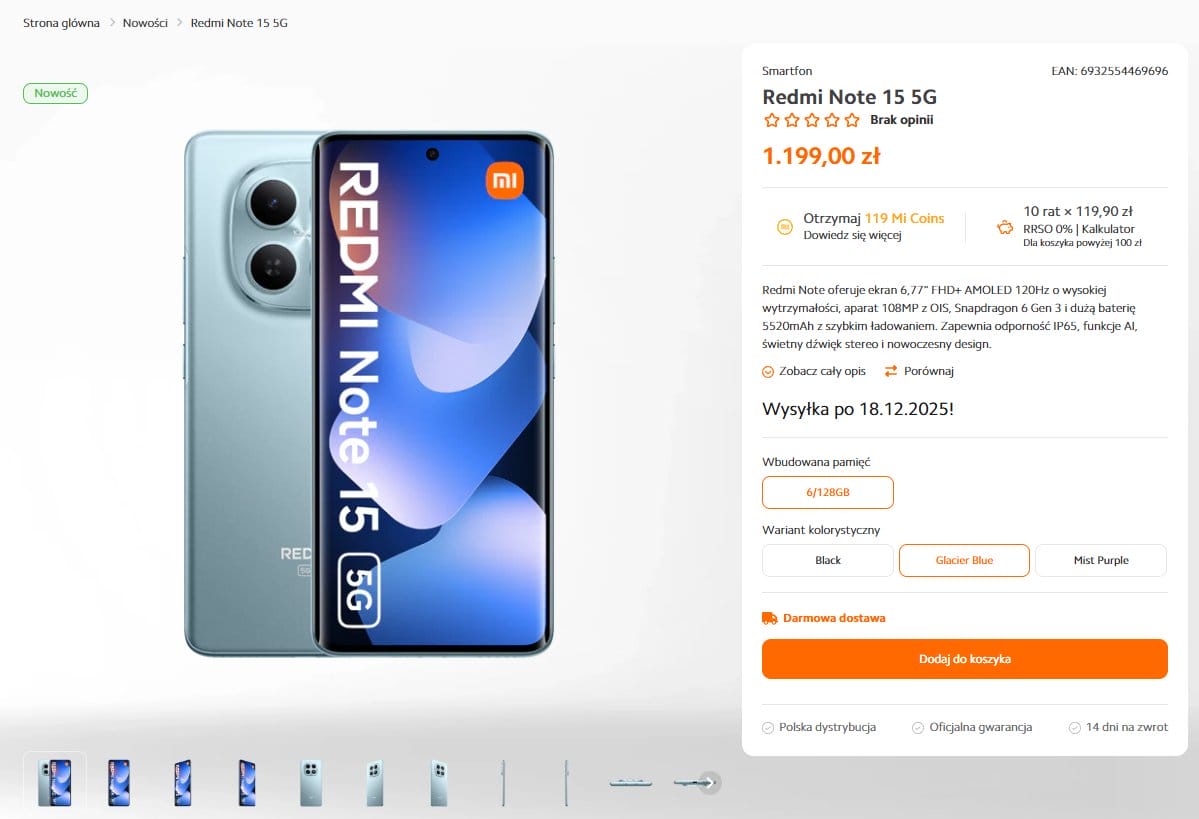 | Redmi Note 15 5G | 1.199 PLN | ~$315 |