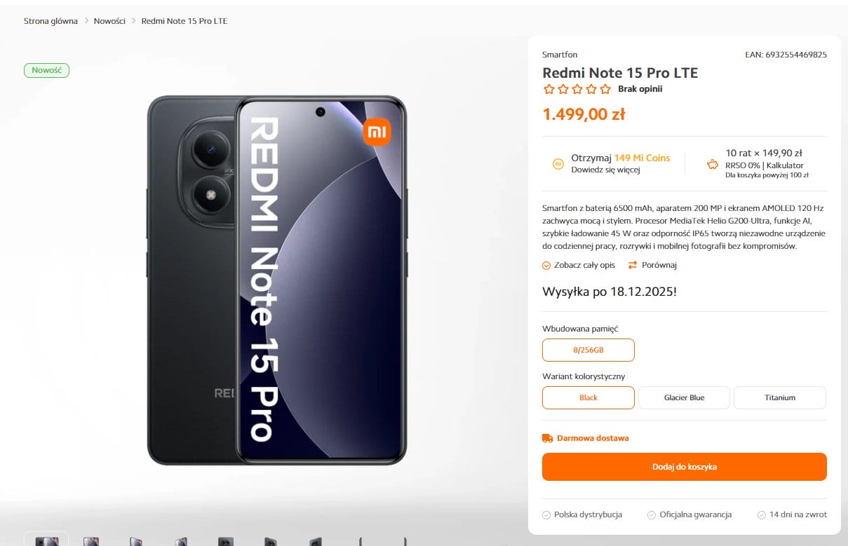 | Redmi Note 15 Pro LTE | 1.499 PLN | ~$395 |