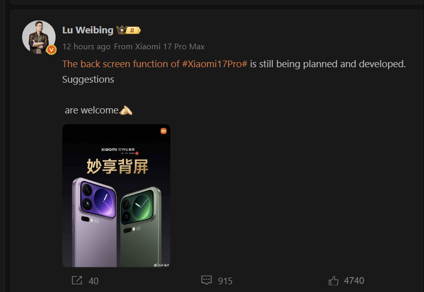 A IT Home informou ainda que Lu Weibing tuitou no Weibo, pedindo aos usuários que enviassem sugestões para tornar a tela traseira da Xiaomi mais funcional e inteligente. Isso indica o forte da Xiaomi no desenvolvimento e na inovação voltados para a comunidade.