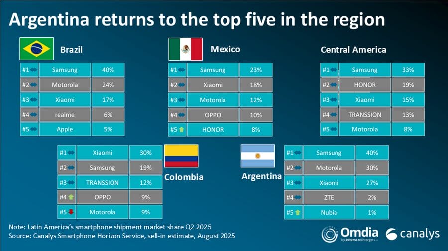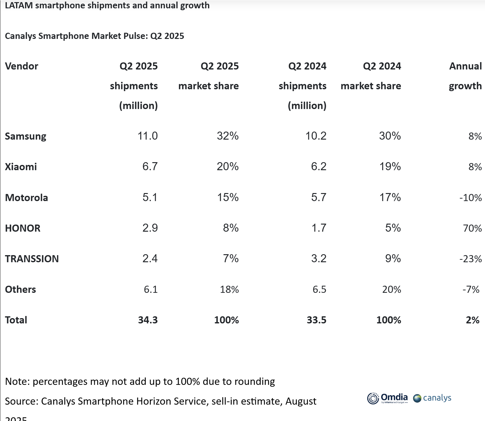 A Xiaomi acaba de apresentar um desempenho impressionante na América Latina, atingindo o maior número de remessas de todos os tempos. Os dados mais recentes da Canalys mostram que a Xiaomi vendeu 6,7 milhões de smartphones no segundo trimestre de 2025 – um aumento de 8% em relação ao ano anterior. Embora o mercado geral de smartphones na região tenha se mantido praticamente estável (apenas 2% de crescimento, atingindo 34,3 milhões de unidades), a Xiaomi superou a concorrência e ficou em segundo lugar, logo atrás da Samsung.