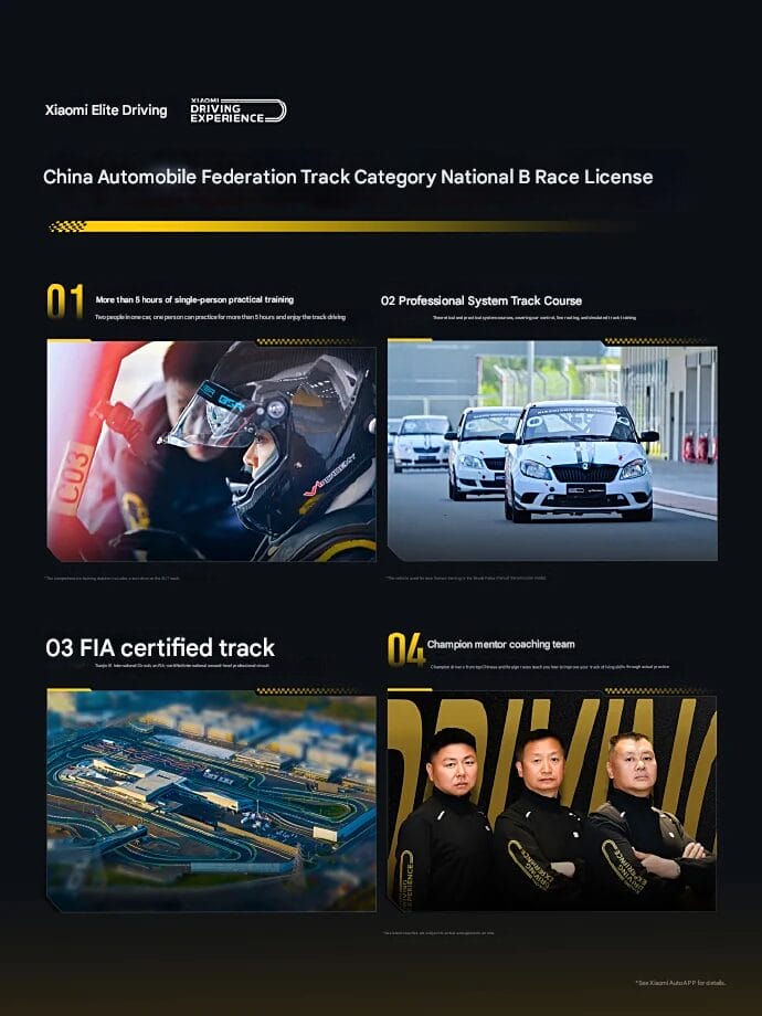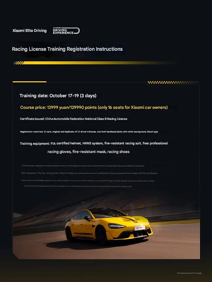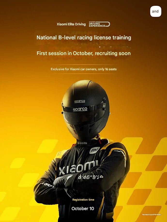 As inscrições para a sessão inaugural de outubro serão abertas em 10 de outubro, às 10h, exclusivamente por meio do aplicativo Xiaomi Auto. No momento, esse programa está disponível apenas na China e custa 12.999 yuans (aproximadamente US$ 1.800). Os aspirantes a pilotos precisarão ter em mãos sua carteira de identidade, carteira de motorista C1, uma foto de uma polegada e informações sobre seu tipo sanguíneo para se candidatar a uma das 16 vagas altamente limitadas.