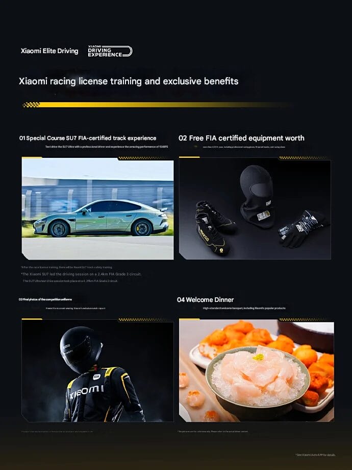 - Experiência de trilha do Xiaomi SU7: Um curso especial dedicado a levar o SU7 aos seus limites em uma pista certificada pela FIA.