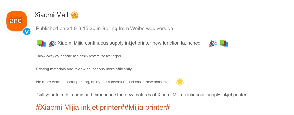 A nova impressora a jato de tinta de alimentação contínua Xiaomi Mijia foi lançada pela primeira vez em março de 2022. Ela é um dispositivo multifuncional que suporta impressão, cópia e digitalização. Além disso, possui alguns recursos avançados, como a impressão remota WeChat, que permite aos usuários imprimir documentos de qualquer lugar usando diretamente o aplicativo WeChat.