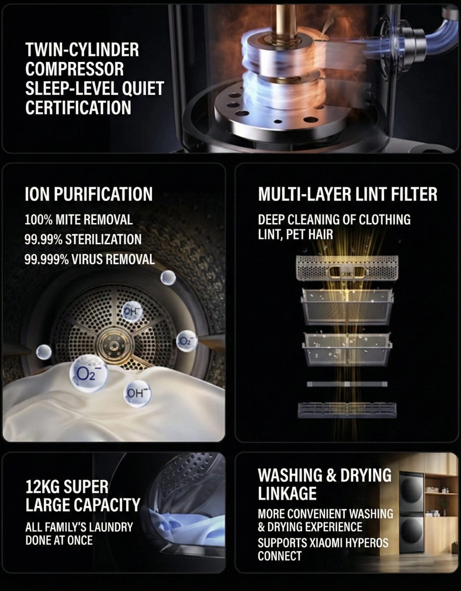 O componente da máquina de lavar desse conjunto usa a tecnologia de supereletrólise desenvolvida pela Xiaomi. Esse mecanismo foi projetado para trabalhar com 20 tipos diferentes de manchas difíceis e garante que as roupas amareladas possam ser branqueadas de uma só vez. Ela suporta uma taxa de lavagem ultra-alta de 1,3, que excede em muito os modelos comuns e proporciona um desempenho de limpeza profunda.