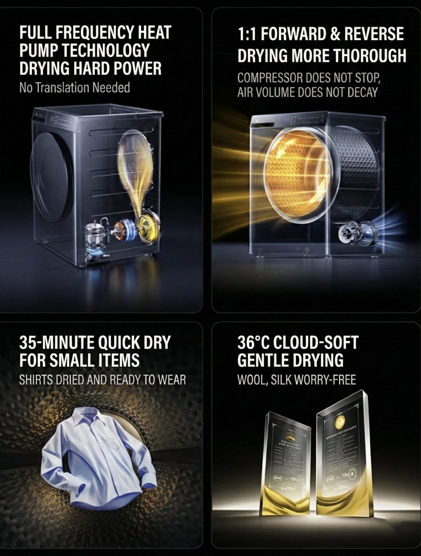 A máquina vem equipada com um sistema avançado de bomba de calor inteligente supereletrolítica que é feito sob medida para a eficiência e o cuidado com os tecidos. A máquina usa um compressor de cilindro duplo e suporta rotação 1:1 para frente e para trás. Essa ação mecânica garante uma melhor secagem, evitando o emaranhamento.
