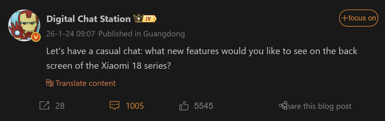 Em um post publicado nesta manhã (24 de janeiro), DCS perguntou a seus seguidores: “Vamos ter uma conversa casual: quais novos recursos você gostaria de ver na tela traseira da série Xiaomi 18?”
