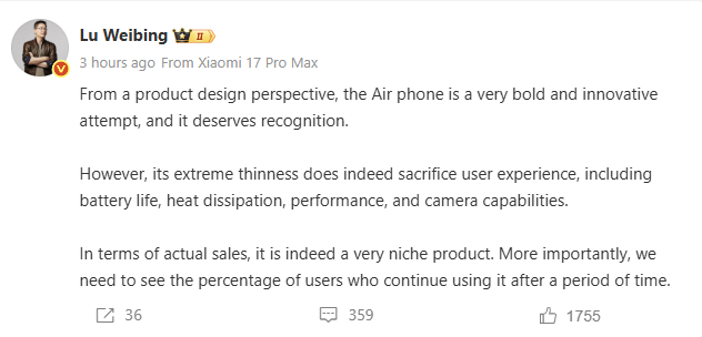 Lu Weibing destacou que, apesar de sua abordagem criativa, os telefones Air atraem um público muito limitado. Ele mencionou que os dados de vendas confirmam seu status de nicho, enfatizando a necessidade de acompanhar a retenção de usuários ao longo do tempo. “É importante observar quantos usuários continuam a usá-los depois que a novidade inicial desaparece”, disse ele. Essa declaração reflete a postura cuidadosa da Xiaomi em seguir a filosofia de design “fino a qualquer custo”.