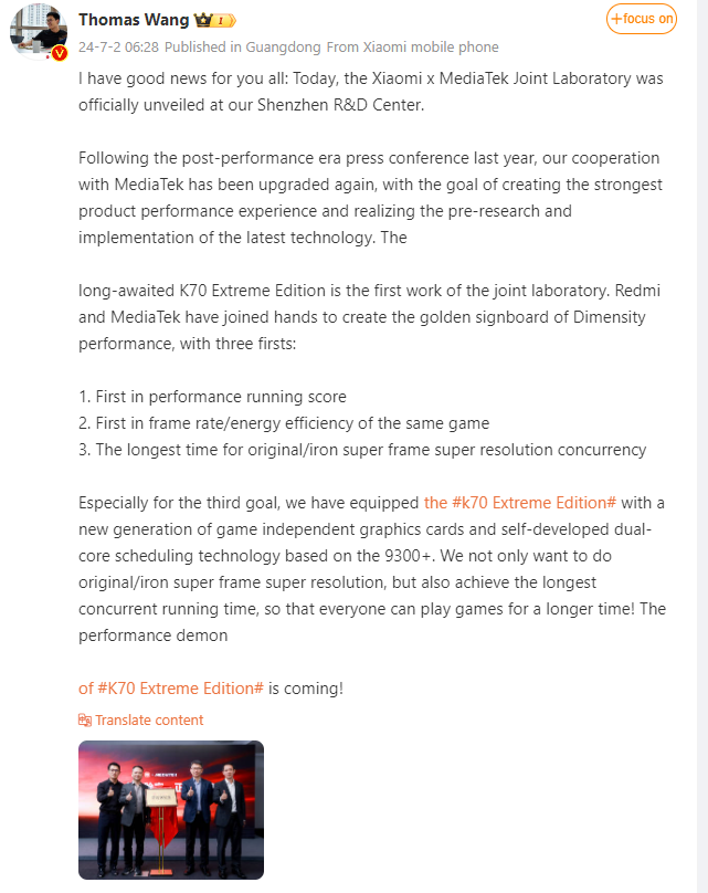 Wang Teng, gerente geral adjunto do departamento de marketing da Xiaomi China e gerente geral da marca Redmi, mencionou que, com o Redmi K70 Ultra, os usuários podem experimentar recursos de ponta. Equipado com o Dimensity 9300+, uma nova geração de gráficos discretos para jogos, a tecnologia de programação dual-core desenvolvida pela própria Xiaomi garante que a resolução de alta qualidade possa ser contínua.