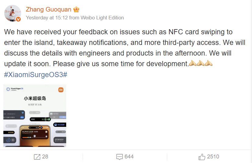 Zhang Guoquan, Diretor do Departamento de Software do Sistema de Telefonia Móvel da Xiaomi, confirmou que a empresa está respondendo ativamente aos comentários dos usuários. Atualmente, a equipe de desenvolvimento está priorizando vários aprimoramentos de alta demanda: