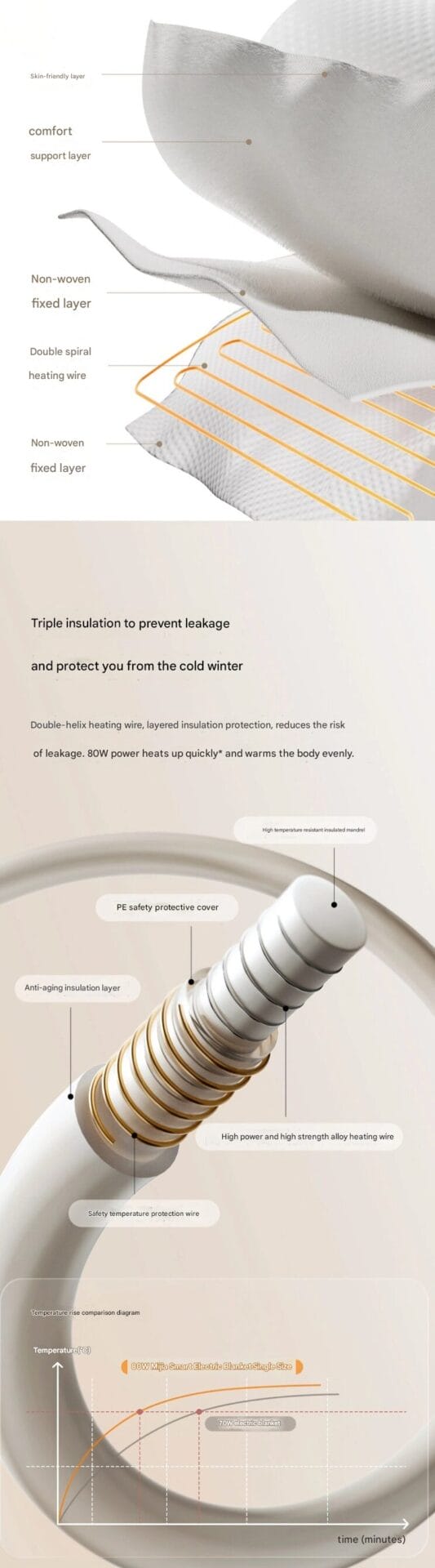 O cobertor elétrico inteligente Mijia é fabricado com tecido macio e aveludado para proporcionar extremo conforto e durabilidade. Em seu interior, ela usa uma estrutura de fio de aquecimento de dupla hélice, que ajuda a equilibrar a distribuição de calor em toda a cobertura. As estruturas têm linhas de fios quase invisíveis para proporcionar um design mais elegante e flexível.