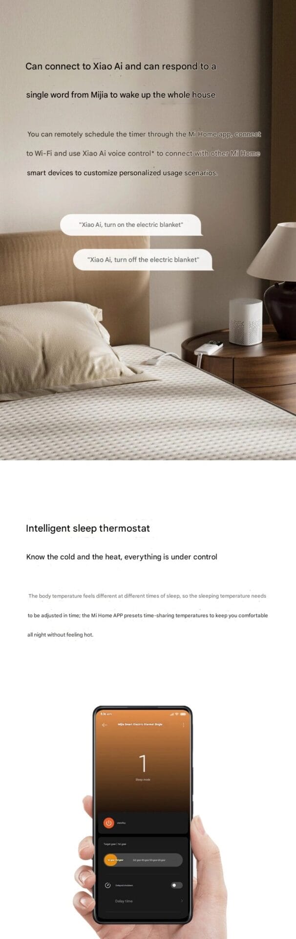 O cobertor se integra totalmente ao aplicativo Mijia, permitindo que os usuários programem temporizadores remotamente, ajustem as zonas de temperatura e ativem o modo de remoção de ácaros para cuidados de higiene sazonais. Os usuários também podem controlar o cobertor por meio do assistente de voz Xiao Ai, permitindo ajustes de temperatura com as mãos livres e rotinas de automação inteligente dentro do ecossistema conectado da Xiaomi.