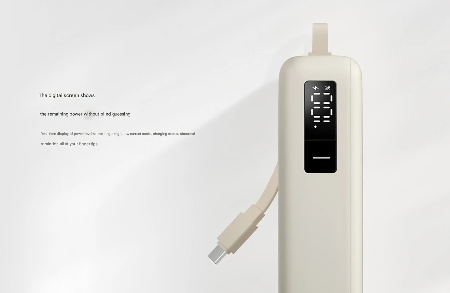 O power bank está disponível em duas opções de cores refinadas – marrom-claro e azul-claro – cada uma com um design moderno e elegante. Um visor digital montado na lateral fornece informações claras e em tempo real sobre a vida útil restante da bateria, permitindo que os usuários monitorem o status da carga rapidamente.