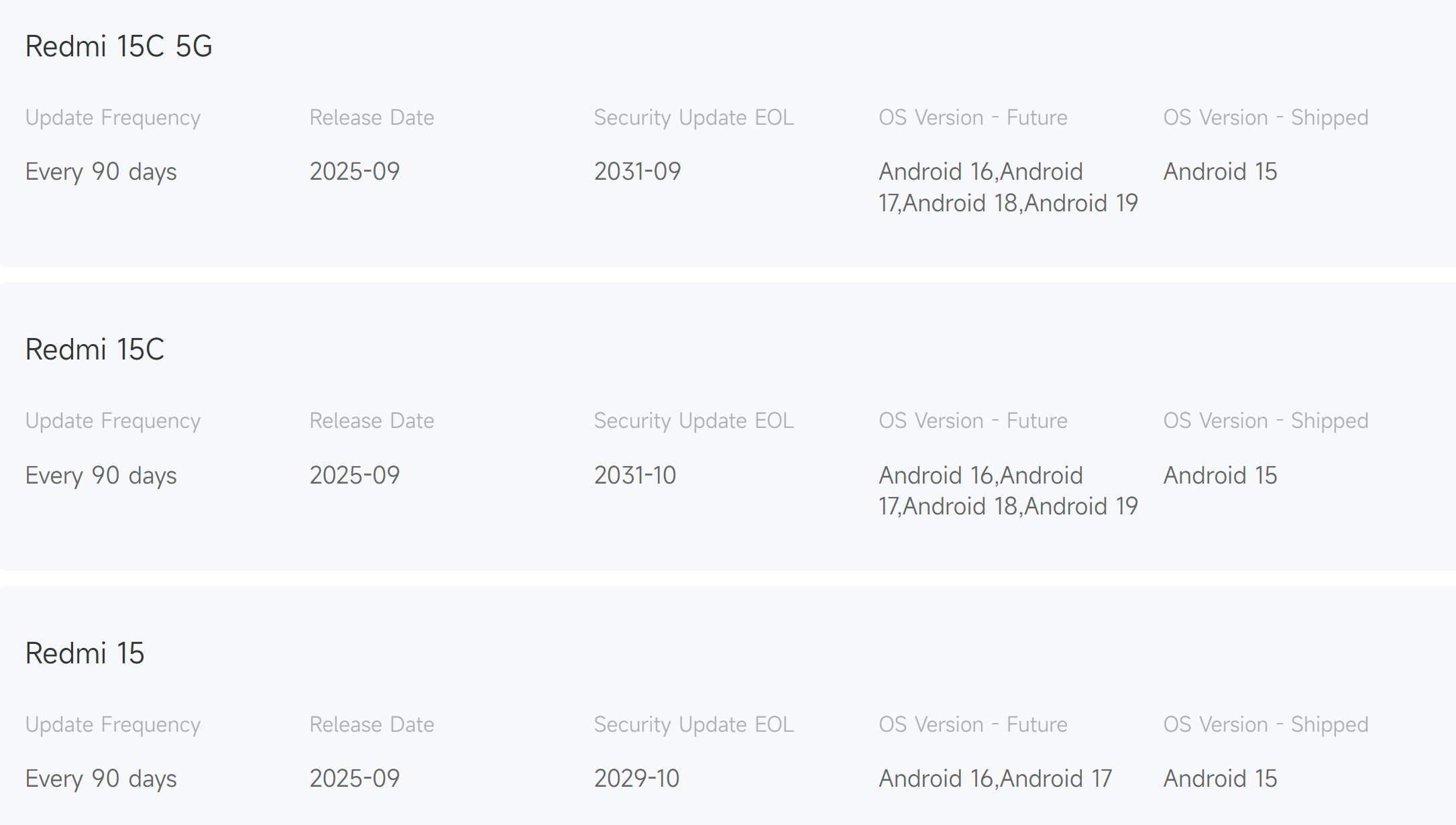 O verdadeiro choque vem quando olhamos para o Redmi 15C e o Redmi 15C 5G. Apesar de serem posicionados como dispositivos de nível inferior, eles estão recebendo uma promessa de atualização de “nível de carro-chefe”. Esses telefones de US$ 100 receberão suporte até o Android 19, com patches de segurança que durarão até outubro de 2031.