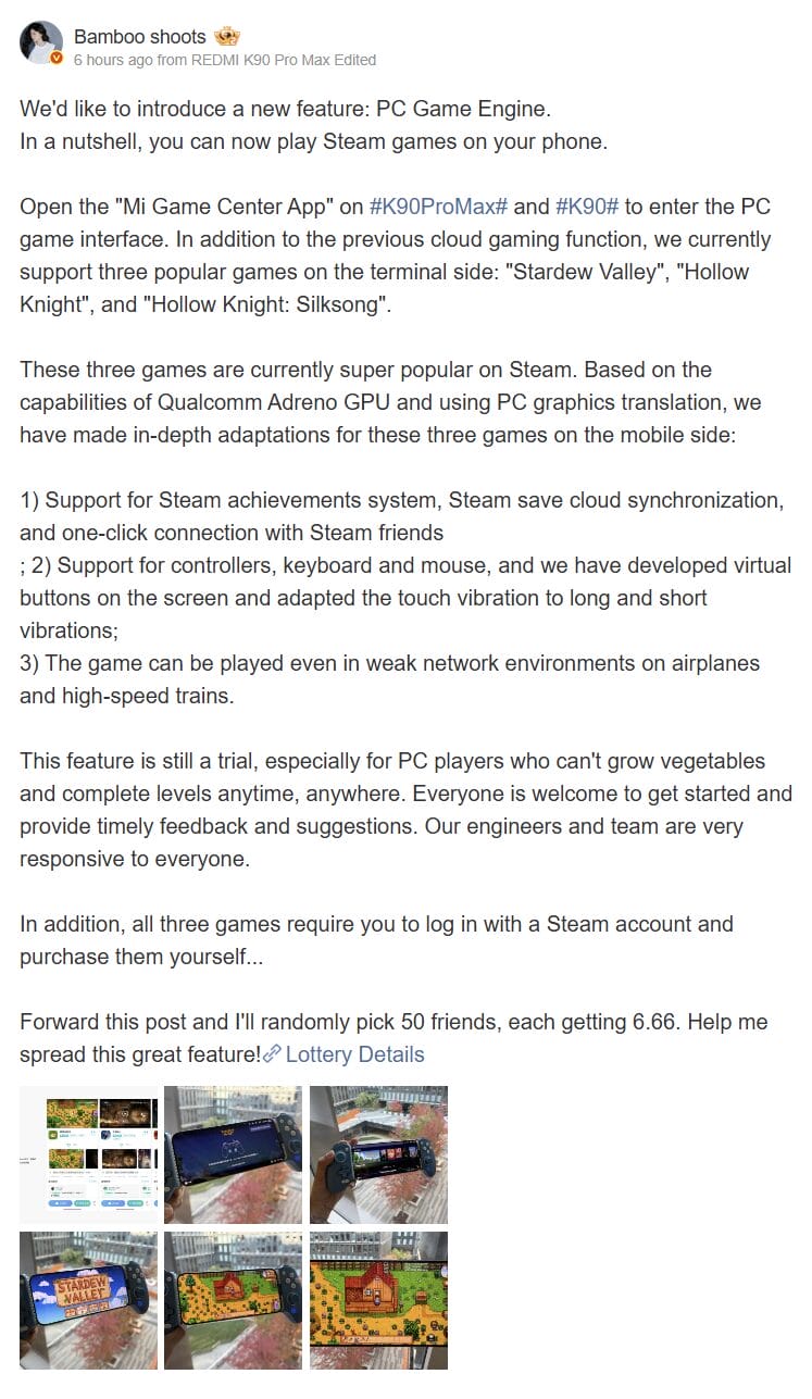 A Xiaomi revolucionou mais uma vez o mundo dos jogos para celular. De acordo com a última declaração feita pelo gerente de produto da REDMI, Sun Cun, foi revelado que os novos smartphones REDMI K90 e REDMI K90 Pro Max vêm equipados com um mecanismo de jogo que suporta o Steam em telefones, permitindo que os usuários executem jogos do Steam em seus smartphones. A lista de jogos que podem ser jogados inclui Hollow Knight, Hollow Knight: Silksong e Stardew Valley, de acordo com o anúncio da conta oficial da Sun Cun no Weibo.