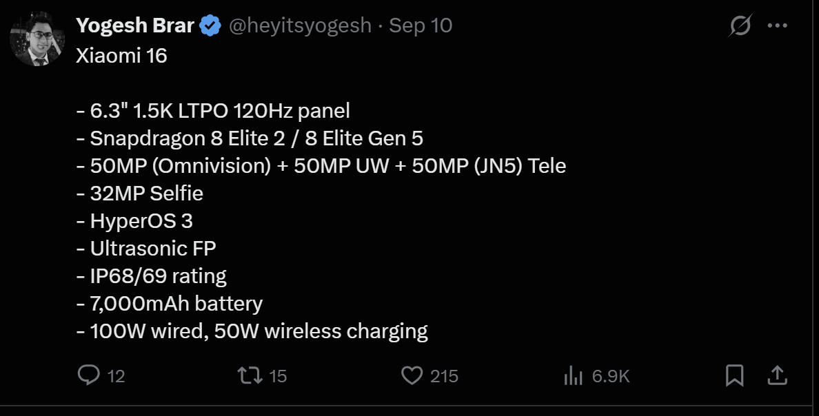 A expectativa está aumentando em todo o setor de tecnologia à medida que surgem novos vazamentos sobre o Xiaomi 16 e, sinceramente, é difícil ignorar esses rumores sobre as especificações. O especialista do setor @heyitsyogesh compartilhou detalhes que sugerem que a Xiaomi está se preparando para estabelecer uma nova referência para os principais dispositivos este ano. Os destaques? Espera-se que o tão esperado chipset Snapdragon 8 Elite Gen 5 seja lançado aqui, juntamente com uma enorme bateria de 7.000 mAh – uma capacidade de energia que posiciona o Xiaomi 16 como um sério concorrente para profissionais que exigem resistência e velocidade. Notavelmente, essas atualizações se baseiam na base estabelecida pelo Xiaomi 15 e têm como objetivo alavancar a próxima evolução do HyperOS da Xiaomi.