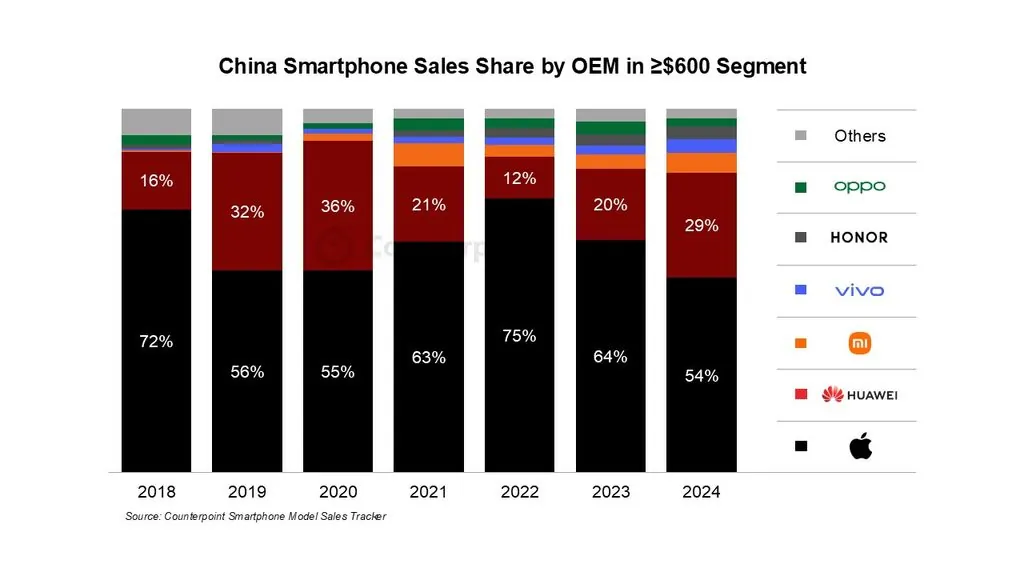 m mercado de smartphones antes do ressurgimento do Huawei 5G. No entanto, essa porcentagem caiu para 54% após o aumento da concorrência. Enquanto isso, a Xiaomi está capitalizando seu ecossistema HyperOS por meio da otimização de software com IA para conquistar clientes que buscam uma alternativa atraente aos telefones da Apple e da Huawei.