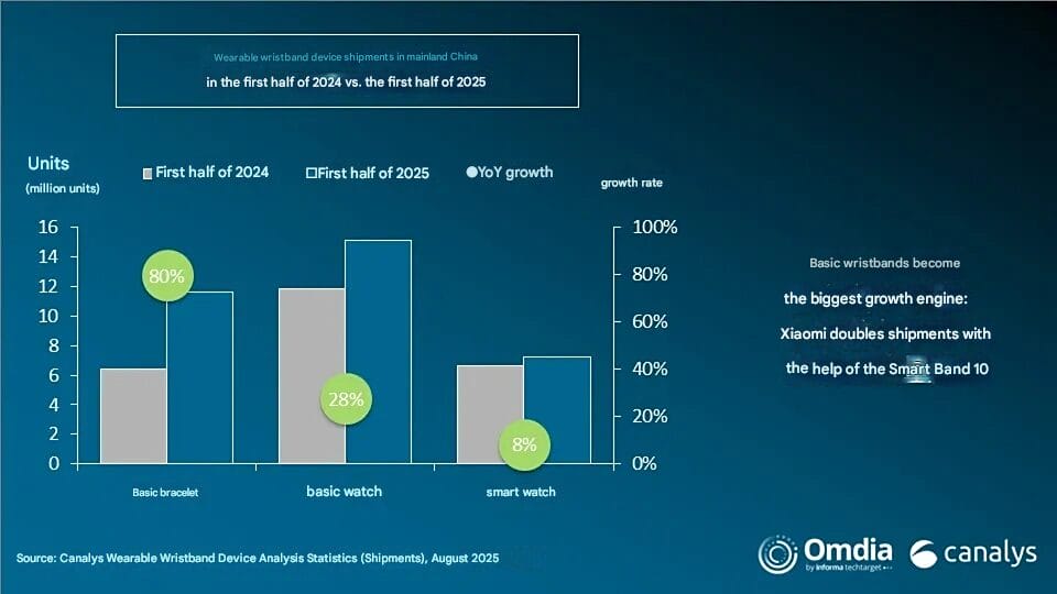 O mercado de tecnologia vestível na China continental teve um impulso significativo no primeiro semestre de 2025, e a Xiaomi está liderando o movimento. De acordo com o último relatório da Canalys, as remessas do setor aumentaram 36% em relação ao ano anterior, atingindo 33,9 milhões de unidades. A Xiaomi se destaca aqui – enviando 11 milhões de dispositivos e registrando uma notável taxa de crescimento de 101%. O bom desempenho da empresa é atribuído em grande parte à popularidade de produtos como a Xiaomi Smart Band 10 e seu robusto ecossistema Xiaomi HyperConnect.