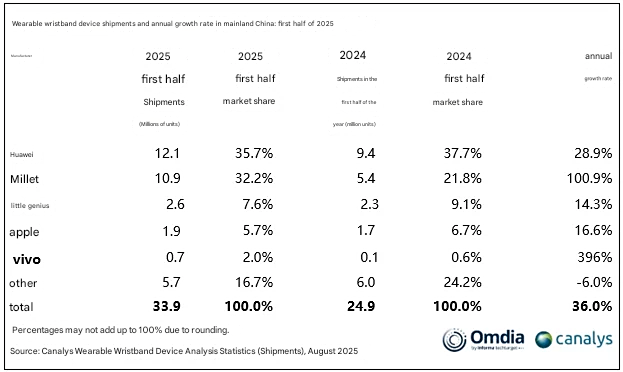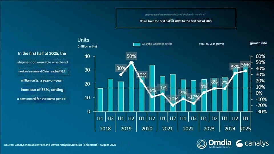 A Huawei continua sendo a líder de mercado, com 12 milhões de unidades vendidas e 36% de participação, mas a Xiaomi está diminuindo a diferença rapidamente, agora com 32% de participação. Ambas as empresas, pela primeira vez, ultrapassaram a marca de 10 milhões de unidades em um único semestre. O crescimento foi impulsionado principalmente pelas pulseiras básicas, que registraram um aumento de 80% nas vendas – impulsionado por subsídios nacionais e grandes eventos promocionais que ampliaram o mercado.