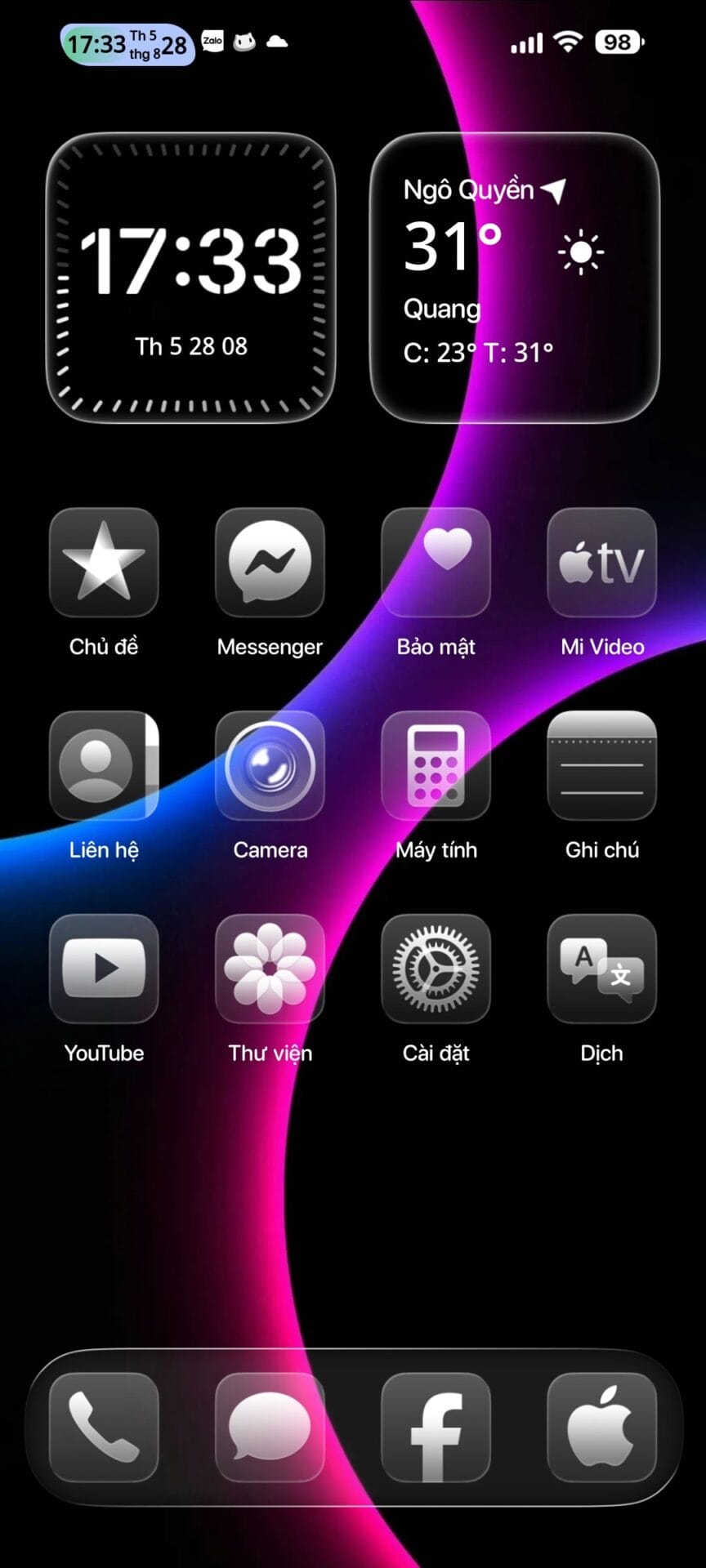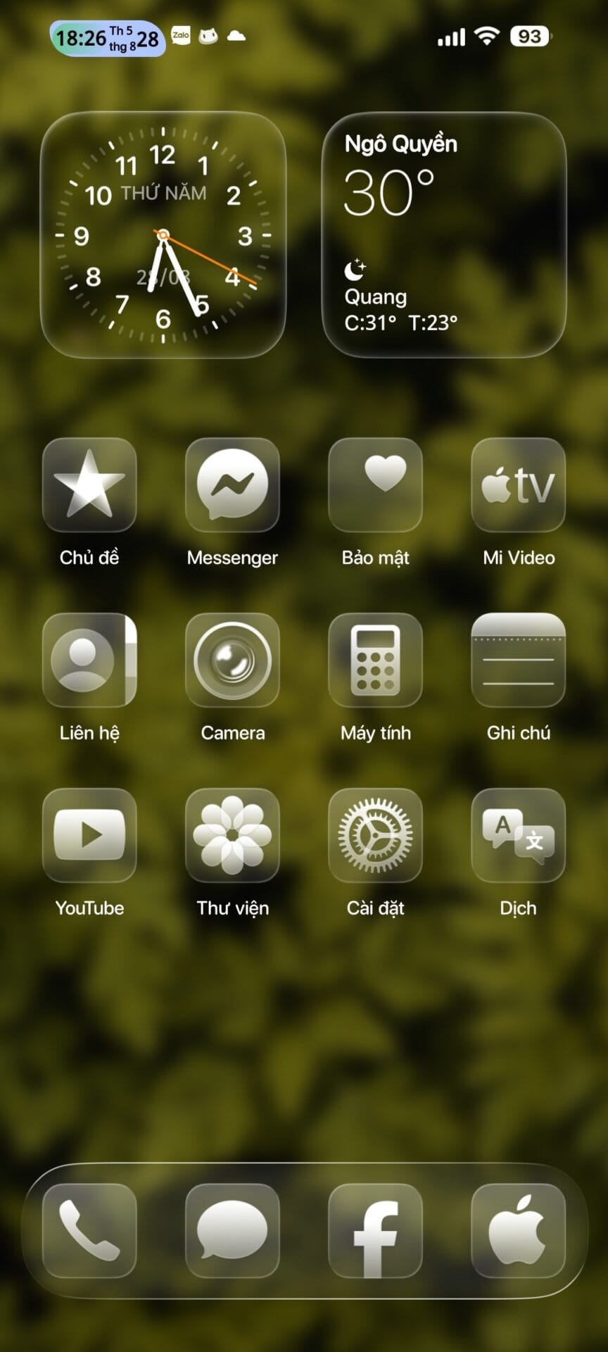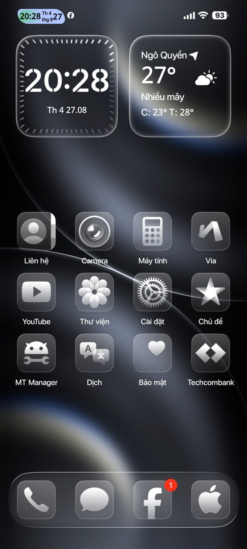 - Aplicativo: Esse tema altera os ícones de aplicativos na tela inicial, dando a eles uma textura transparente, semelhante a vidro, e a tela de bloqueio. Essa estrutura permite que os ícones se misturem perfeitamente com o papel de parede, criando um efeito Liquid Glass fluido e moderno. A combinação desses dois temas maximiza a consistência visual.