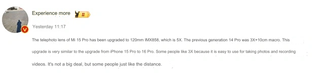 Laut dem Weibo-Blogger @体验more hat das mit Spannung erwartete Xiaomi 15 Pro ein ernsthaftes Upgrade in Sachen Teleskopie erhalten, indem der 120-mm-Sony-IMX858-Sensor mit 5fach optischem Zoom eingebaut wurde. Das war ein ziemlicher Sprung gegenüber dem vorherigen Xiaomi 14 Pro mit seinem 3fachen optischen Zoom in Kombination mit einem 10 cm Makroobjektiv. Der neuere Sensor des Xiaomi 15 Pro bietet eine bessere Zoomfunktion und damit eine bessere Erfahrung beim Fotografieren.