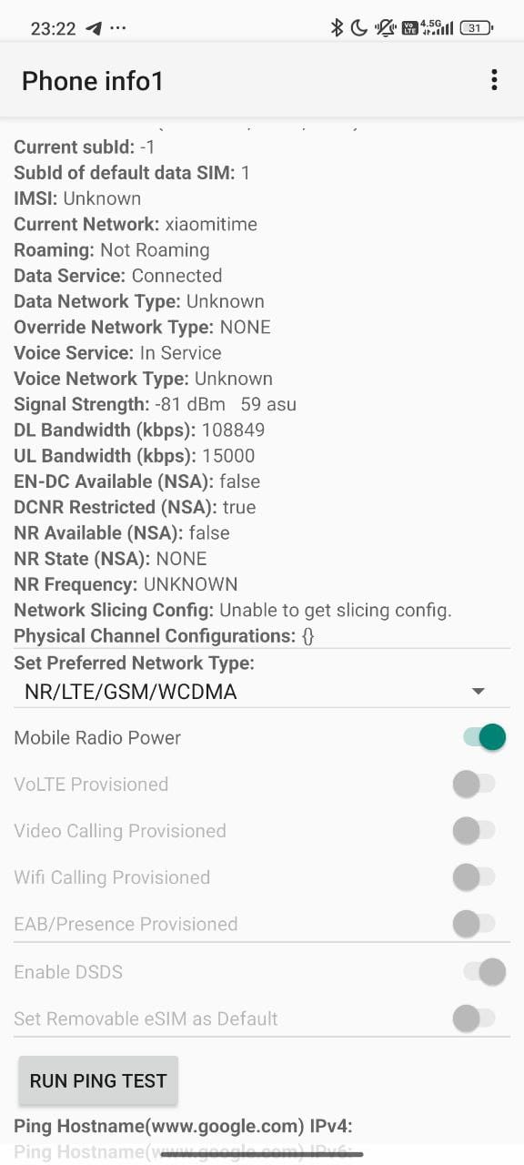 O código *#*#4636#*#* desbloqueia o que é chamado de “cockpit” ou a interface do modem de rádio. A intensidade detalhada do sinal em unidades dBm é fornecida, em vez das barras representadas no telefone. Os administradores de rede configuram o recurso Set Preferred Network Type (Definir tipo de rede preferencial) para definir o telefone como “LTE Only” (Somente LTE) ou “NR Only” (Somente NR) para que ele não mude para 2G ou 3G em zonas de sinal baixo.