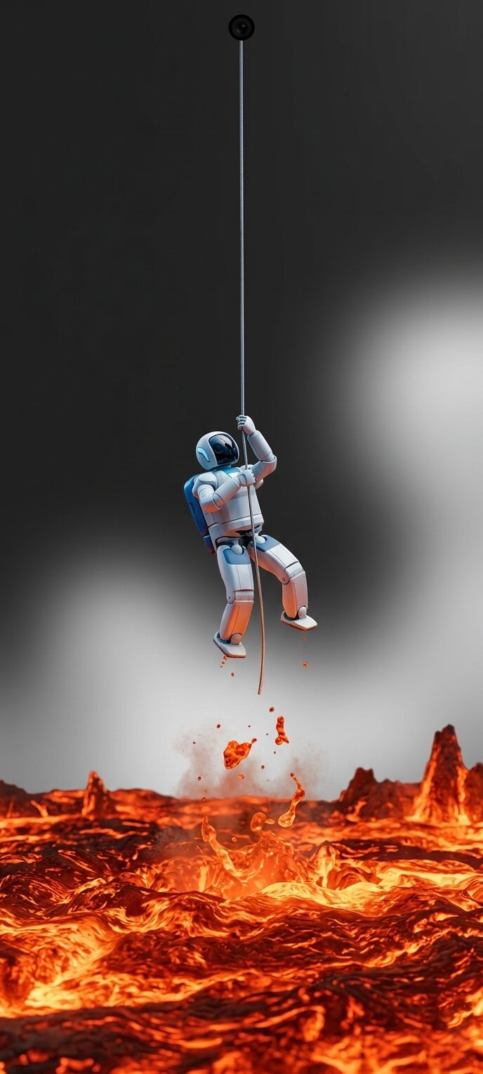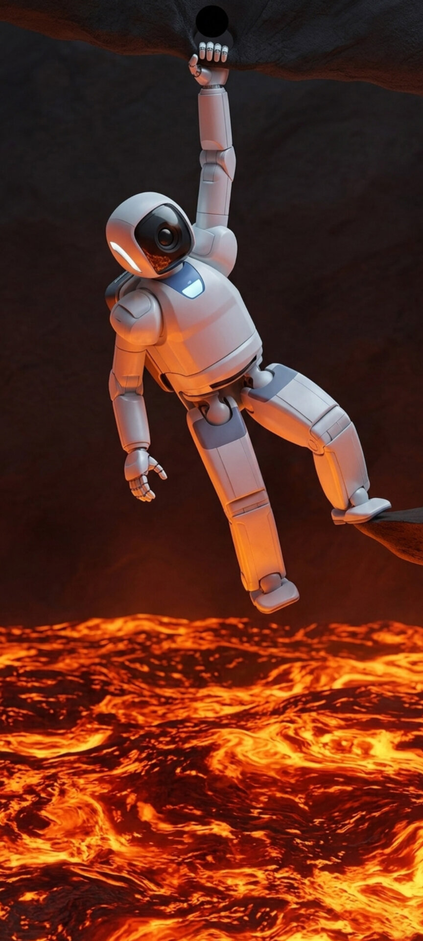 • Robot de ciencia ficción: «Un pequeño robot que se agarra desesperadamente a un cable atado al recorte de la cámara para evitar caer en un mar de lava incandescente».