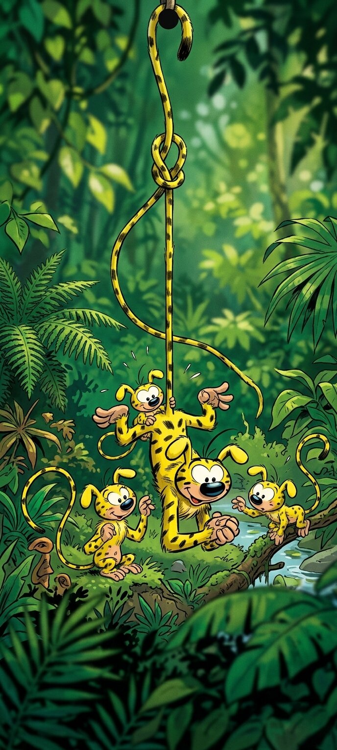 • Marsupilami: «Marsupilami colgando por su larga cola del recorte de la cámara en un frondoso bosque selvático».