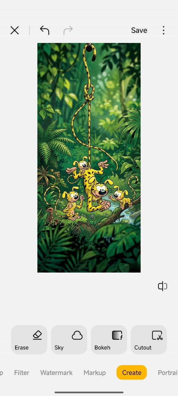 Los generadores externos de IA suelen colocar una pequeña marca de agua en la esquina de la imagen generada. Para conseguir un aspecto impecable, abre el fondo de pantalla generado en la aplicación Galería nativa de tu dispositivo. Ve a Editar > Crear IA > Borrar, y simplemente borra la marca de agua con la herramienta.