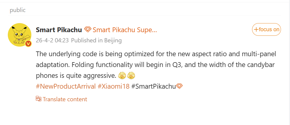 Optimizaciones del factor de forma y de la pantalla: En cuanto al software, la base de código subyacente de Xiaomi HyperOS se está sometiendo actualmente a una rigurosa optimización para una relación de aspecto totalmente nueva y una adaptación avanzada a múltiples paneles. Los teléfonos estándar «candybar» (estilo losa tradicional) están adoptando una anchura muy agresiva y ultraestrecha para mejorar la ergonomía con una sola mano. Además, las adaptaciones de la funcionalidad plegable empezarán a entrar en la base de código en el tercer trimestre, lo que apunta a una sinergia perfecta del ecosistema entre la serie estándar Xiaomi 18 y los plegables de próxima generación.