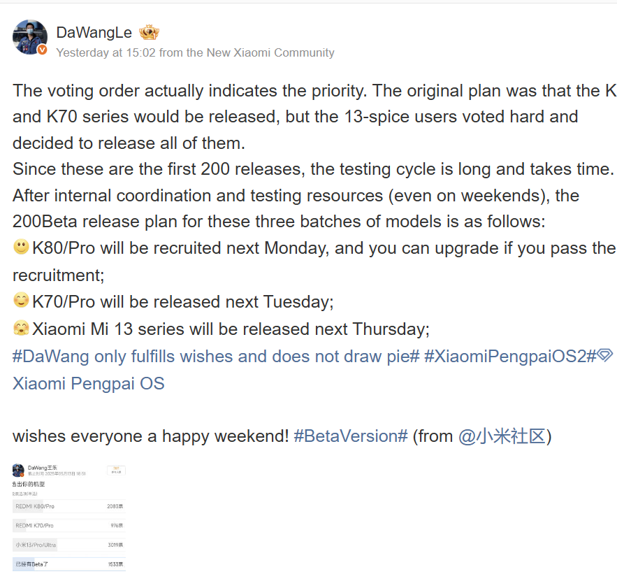 Xiaomi ha confirmado oficialmente que lanzará HyperOS 2.2 para un total de ocho dispositivos el próximo mes de mayo, con optimizaciones basadas en Android 15 y nuevas funciones. El plan de despliegue, revelado por DaWangLe, una persona de confianza de Xiaomi, primero dio prioridad a las series Redmi K80 y K70, pero debido a la enorme respuesta de los usuarios de Xiaomi 13, decidió ampliar el despliegue. El despliegue se realizará por oleadas: la serie Redmi K80 será la primera en recibirlo el lunes 12 de mayo, seguida de la serie Redmi K70 el martes 13 de mayo y, por último, la serie Xiaomi 13 el jueves 15 de mayo.