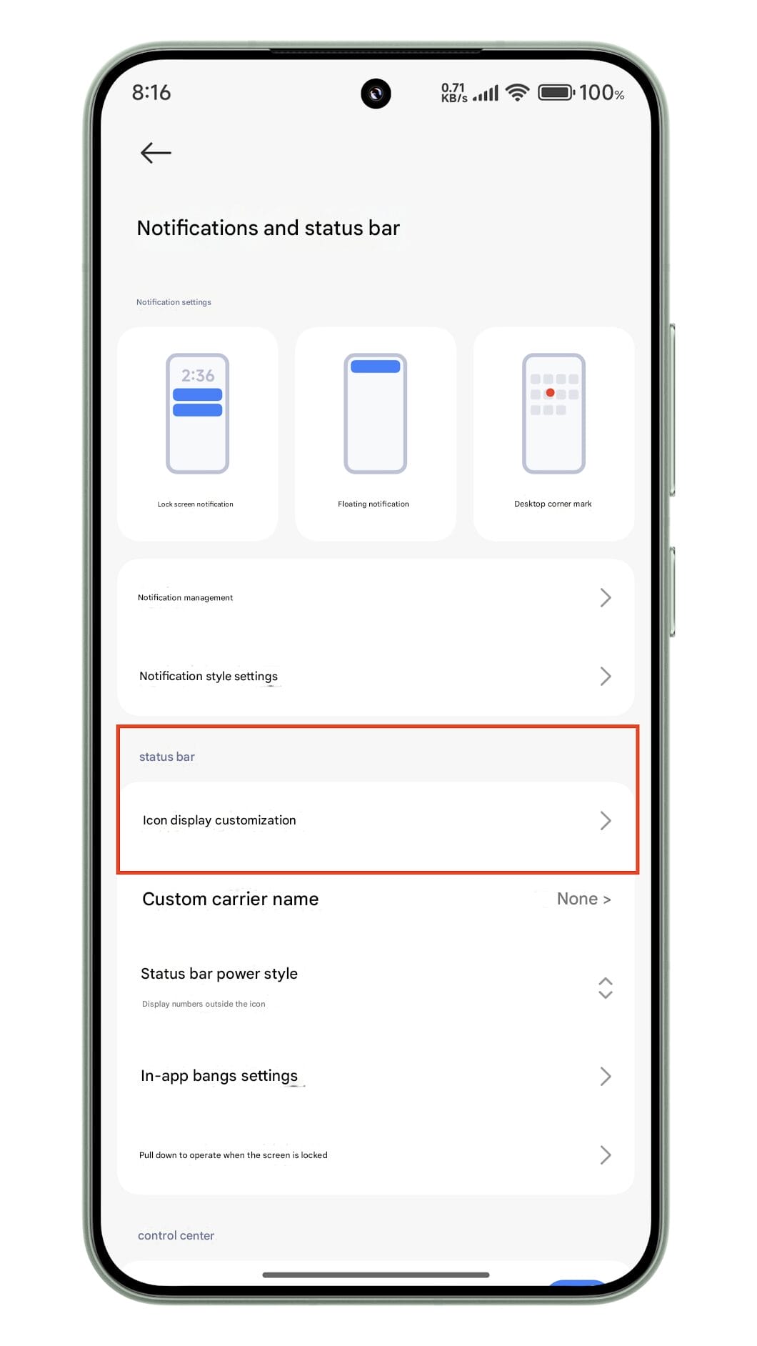 La nueva «Personalización de la visualización del icono de la barra de estado» es un guiño a las opciones de personalización que debutaron con AOSP Android 6, pero con el pulido y la atención al detalle que Xiaomi nos tiene acostumbrados con sus actualizaciones de software y mejoras de la interfaz de usuario.