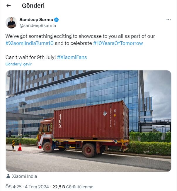 El anuncio más emocionante será la presentación del lujoso Xiaomi SU7. Aunque esta berlina de lujo de clase C no está disponible en la India para su venta inmediata, la empresa la lanzará delante de la gente aquí en Bengaluru. Sandeep Sarma, de Xiaomi India, escribió en Twitter: «Tenemos algo emocionante que mostraros a todos como parte de nuestro #XiaomiIndiaTurns10 y para celebrar #10yearsOfTomorrow». También había una imagen de un camión junto a este tuit, lo que indica que será un lanzamiento de alto nivel y no un producto más.