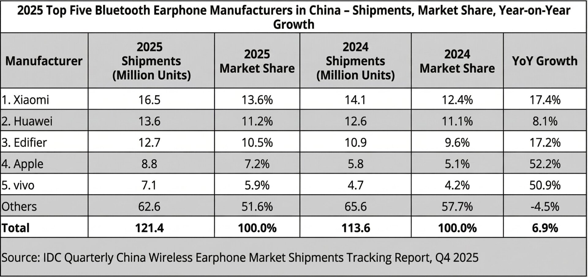 International Data Corporation (IDC) ha publicado su «Informe trimestral de seguimiento de envíos del mercado chino de auriculares inalámbricos, cuarto trimestre de 2025», que confirma que Xiaomi se ha hecho oficialmente con la corona como principal fabricante de auriculares Bluetooth en China para 2025. Con la asombrosa cifra de 121,37 millones de unidades enviadas a todo el sector -un aumento interanual del 6,9%-, Xiaomiha aprovechado con éxito su agresiva estrategia de precios y su profunda integración con el ecosistema Xiaomi HyperOS para superar a competidores como Huawei y Edifier.