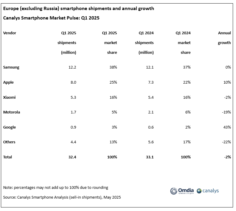The European smartphone market outside of Russia suffered a 2% decline during Q1 2025, owing mostly to a lackluster entry-level smartphone demand. Canalys’s Senior Analyst, Runar Bjørhovde, cited a number of factors contributing to the decline.