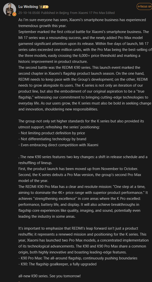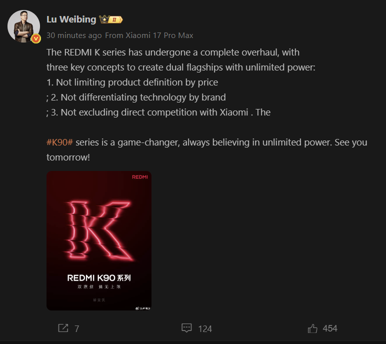 Lu Weibing, sócio do Grupo Xiaomi e presidente da divisão móvel, anunciou que a série REDMI K90 será lançada oficialmente amanhã. Em sua recente postagem no Weibo, ele descreveu o lançamento como o segundo capítulo da temporada de lançamentos do carro-chefe da Xiaomi, após a estreia bem-sucedida da série Xiaomi 17. De acordo com Weibing, a linha REDMI K90 marca um grande passo para a marca, apresentando especificações de ponta, um posicionamento renovado e até mesmo a concorrência direta com os principais telefones da Xiaomi.