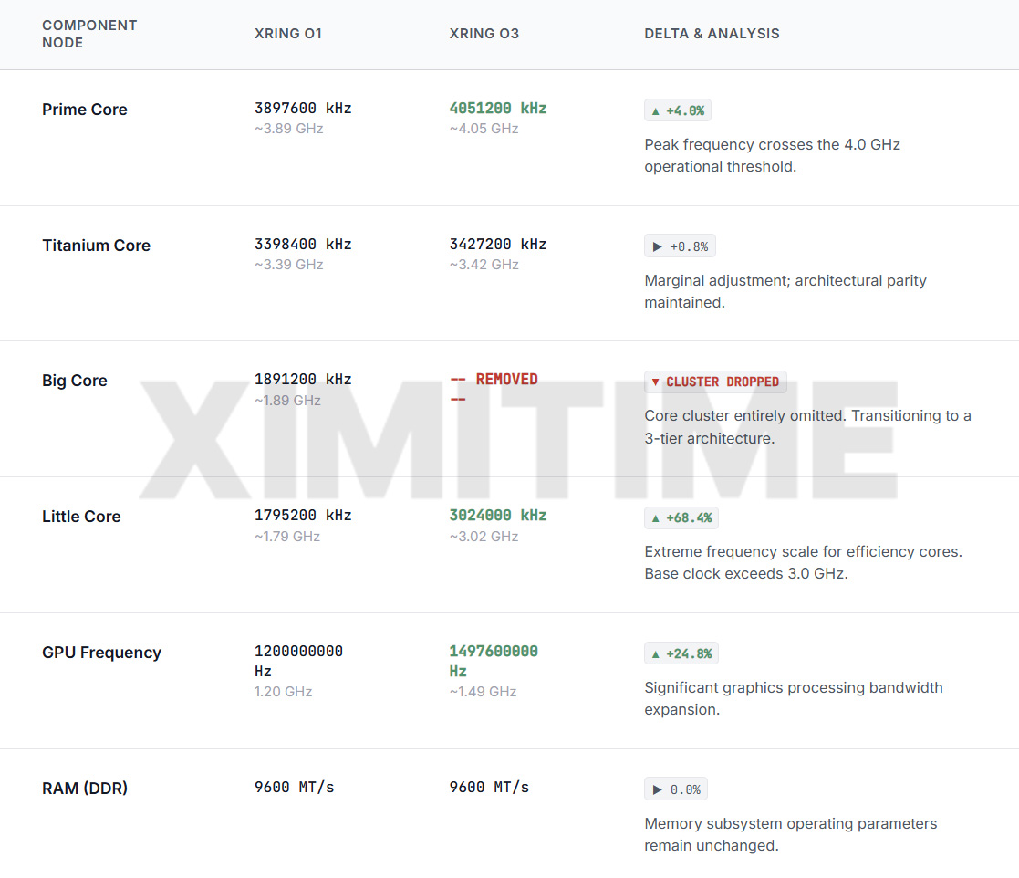 • A Radical Architecture Change – Where is the “Big Core”?: The most shocking discovery in the Mi Code is the elimination of the traditional “Big Core” cluster. While the O1 utilized a 4-cluster setup (Prime + Titanium + Big + Little), the O3 completely removes the “Big” tier, settling on a streamlined Prime + Titanium + Little architecture.