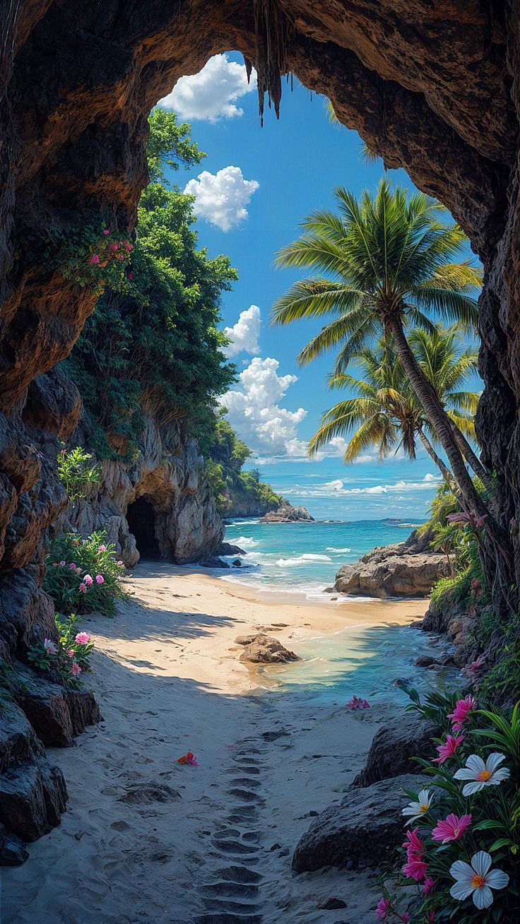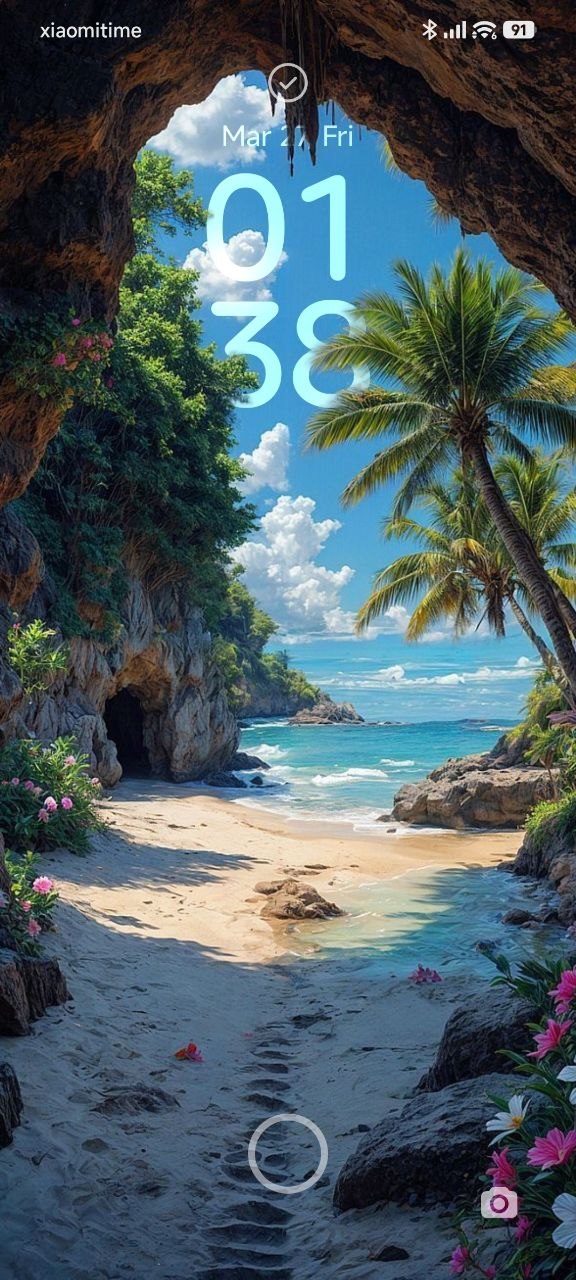 The Magic of Nature and Landscapes: Featuring hidden beaches framed by palm trees and sharp, misty mountain peaks. These designs allow the time widget to blend organically with nature, ideal for users seeking a serene, calming interface.