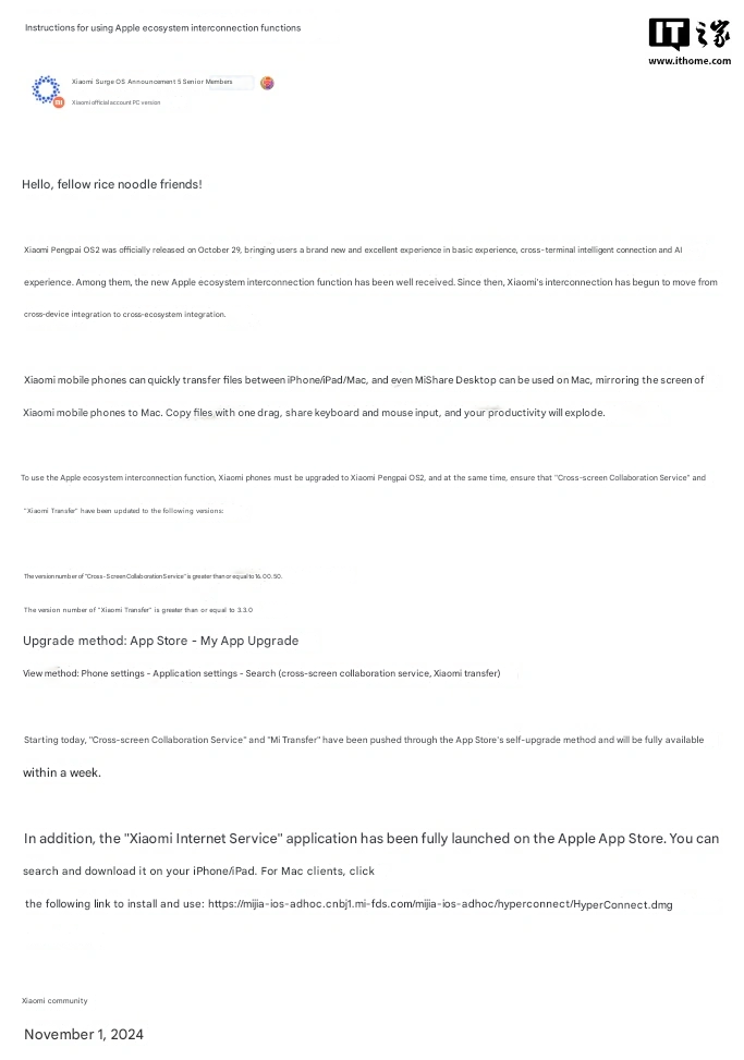 In addition, other than the interconnected features, Xiaomi has pushed the Xiaomi Internet Service app to the Apple App Store, which can be directly searched and downloaded by iPhone and iPad users. This app further bridges the two ecosystems, adding more compatibility and integration for those who own devices from both Xiaomi and Apple.