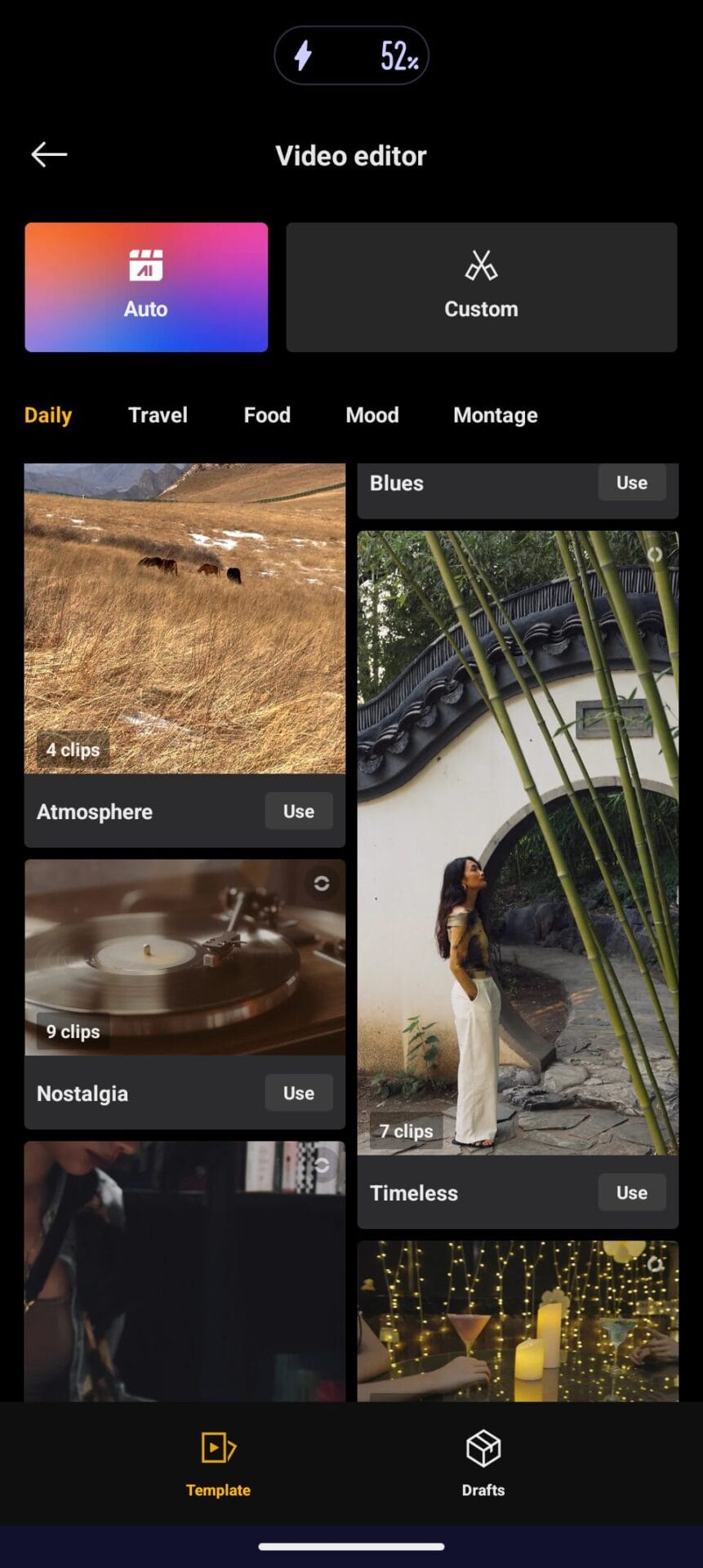 Editor de vídeo: O editor de vídeo embutido vem totalmente equipado com modelos criativos, como “Atmosfera”, “Nostalgia” e “Atemporal” (modo Vlog). Ele suporta a geração automática (AI) e a edição manual (personalizada).