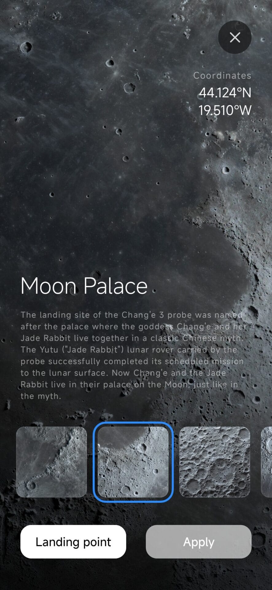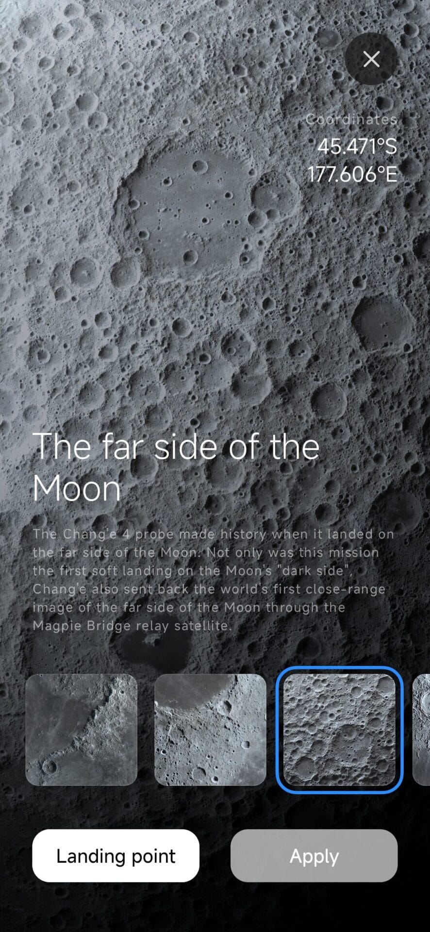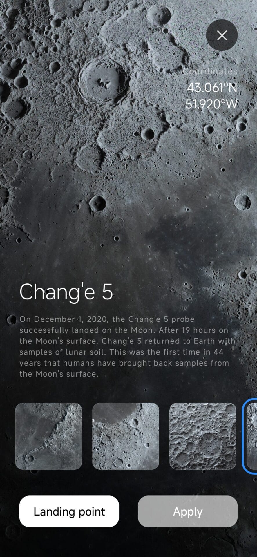 - Chang’e 5: Esse plano de fundo é baseado na missão lunar chinesa. Ele mostra a área explorada pela sonda Chang’e 5, com grandes detalhes da geologia lunar diversificada.