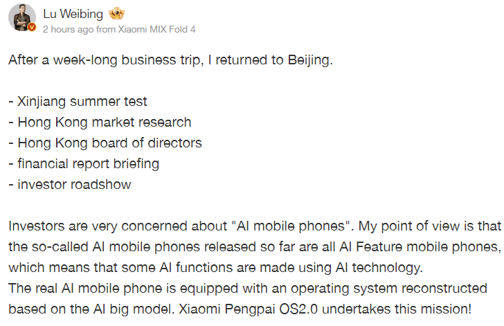 “Investors are very concerned about ‘AI mobile phones.’ My point of view is that the so-called AI mobile phones released so far are all AI Feature mobile phones, which means that some AI functions are made using AI technology. The real AI mobile phone is equipped with an operating system reconstructed based on the AI big model. Xiaomi HyperOS 2.0 undertakes this mission!”